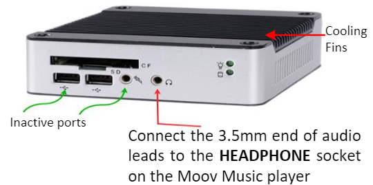 Ensure the Moov Music player’s surroundings provide adequate air flow and the cooling fins are not covered. A clearance of 20cm is recommended on each side & top.